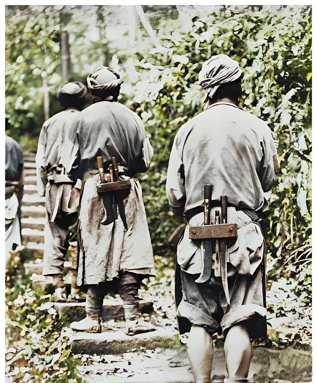 这个插在腰后的木板叫刀架,短刀长刀一字排着,绑带从后腰绕一圈扣紧,石阶湿滑,几个人肩头搭着柴绳往上走,脚腕处缠着布带以防打滑,路边叶子刷到小腿发痒,这阵仗不花哨,都是能砍能削的实伙,现在上山有护林规矩,刀不用带,背包里装的是矿泉水和能量棒,走起来也就少了那点生计的硬气。