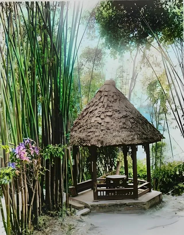 这个亭子叫六角亭,顶上是小木瓦,一片片叠着像鱼鳞,四周被竹海裹住,风一过,亭角晃得人心里也跟着起伏,案几上放着石砚和折扇,坐在里头听竹影窸窸窣窣,像是有人在耳边低语,朋友笑说这地方最适合发呆,写不出诗也能把心事放下半斗,现在公园里也有亭子,新的规整得很,可倚着栏杆,总觉得少了几分旧年的闲散味。