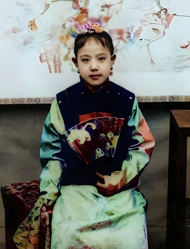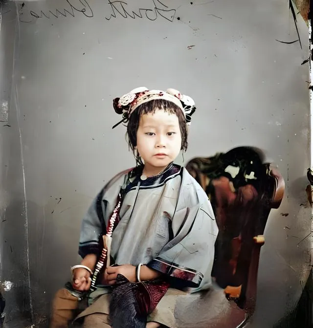 图中这位小姑娘叫广东女童,发髻上压着花样繁复的绒花,银手镯在腕子上亮一下就不动了,衣料是软塌塌的缎子,浅灰里绣着暗纹,坐姿端正,眼神却像从窗缝里往外看,既乖又有点拧巴,这样的神情我小时候在外婆柜子里翻照片时也见过一回,外婆指着说,这样打扮的,大多是家里条件好的孩子,可书房的门并不总给她们开着。