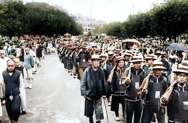 这条长队叫官员出巡,旗子举得高,牌子写得响,可你仔细瞧,官帽褪色,袍摆起毛,抬轿的少年肩窝里勒出一道白痕,风把灰土一层层贴在人脸上,排场是有的,气色却薄,叔叔看完咂舌,说起来,时代一紧,花哨就显得可笑了,现在出门一辆车足够,谁还恨不得把家底都挂在身上。
