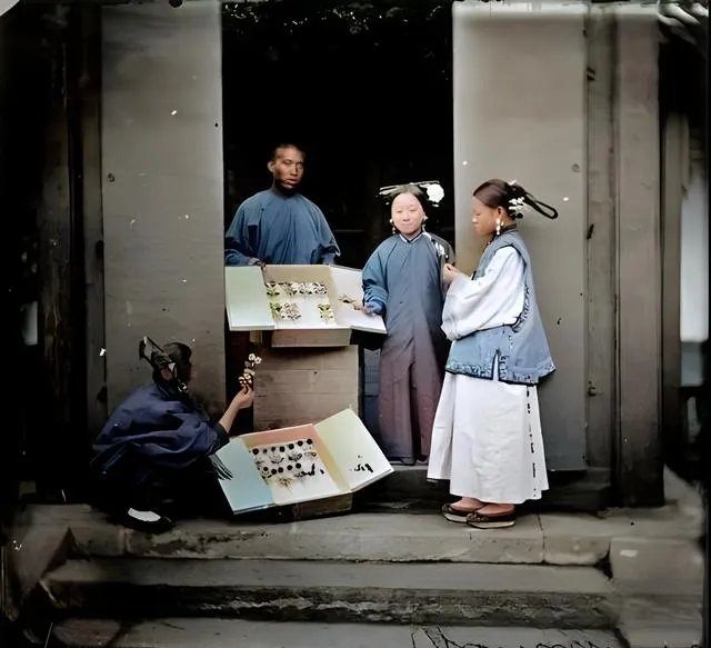 这一摊是卖头饰的小贩,木匣子翻开就是一面小世界,珠花簇着,金叶子在纸上躺得规整,富贵人家的妇女挑着看,指尖挨着簪脚,生怕划到手,边上小丫头蹲着,手里拿着一朵不肯放,老板不急不躁,把颜色放在光底下给人比,妈妈笑说,女人买东西就这样,先看个亮,再看轻不轻,最后才问价钱,以前上门叫卖,讲的是眼缘,现在我们动动手指头下单,快是快了,味道却淡了些。