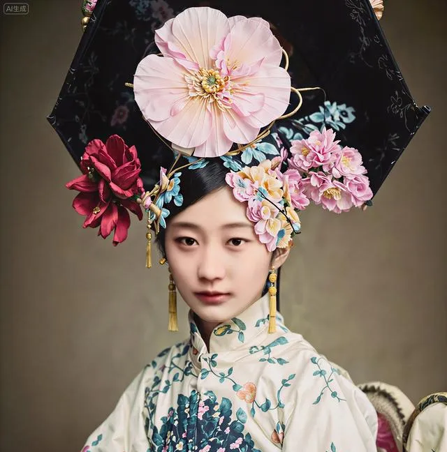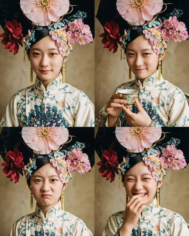 这个系列最有劲的地方是把“端方”拧了个弯,图中这位叫王敏彤的格格,史册里写她娴静内敛,落在镜头里却会眯眼、会鼓腮、会偷笑,像门口追猫的小姑娘,外婆说,人哪有一张脸过一辈子的,平日里不显,遇着知心人就闹两句,AI把这“闹”拾出来了。