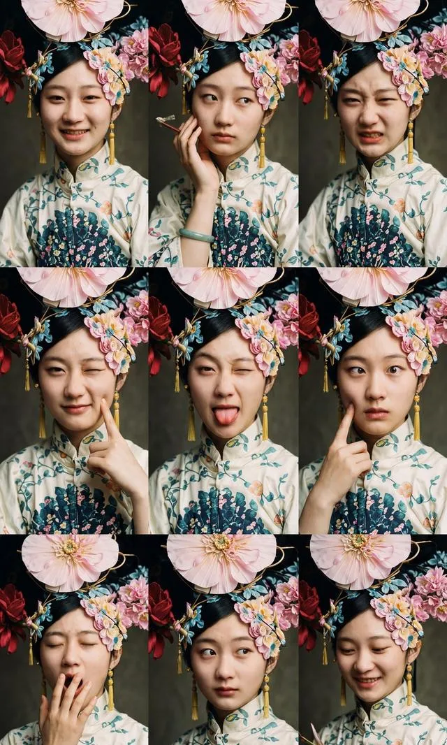 我最喜欢那张抬手捻耳坠的,指节细,金穗轻摆,像在桌下悄悄拽你的袖子,下一格就换成皱鼻子,像尝了口苦茶,妈妈看见笑出声,说女孩子就是灵,别老叫她们端着,小时候我被拍照,妈妈在后头比划“笑一个”,我憋着笑,最后笑成了气,照片留到现在,还是那股子憋劲。