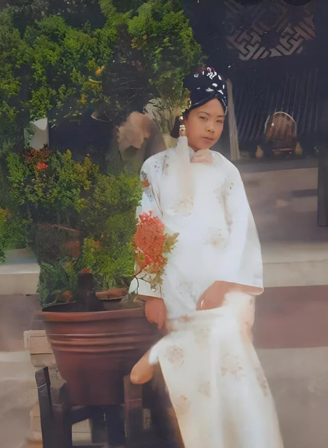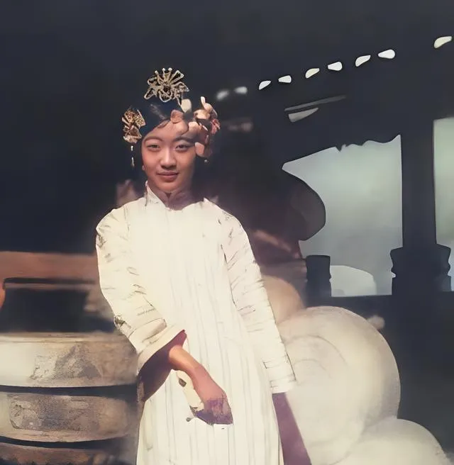 图中这位白袍女子叫文秀,妆容淡而稳,指尖搭在扶手上,像是怕惊动了院里的风,最醒目的其实不是人,是她身旁那盆修得规整的绿植,小小一棵,正好挡住她半身,像她有意躲在树后,又像坐在树旁歇口气,她的衣料发旧却干净,袖口褶子里藏着一种不肯妥协的劲儿。