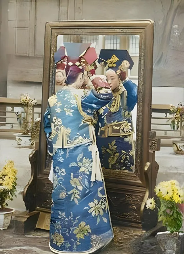 这张背影的主角是瓜尔佳氏幼兰,她对着大镜子把头面轻轻往上一扶,蓝地织金的大褂子一动,花鸟就跟着游起来,镜框厚重,像个会吞人的门,她却只管看着自己那一抹正红,发间的流苏垂下来,晃得人眼里都是光。