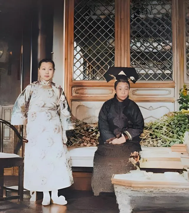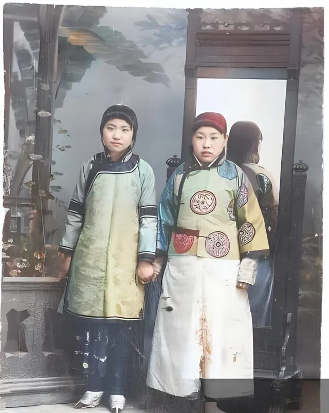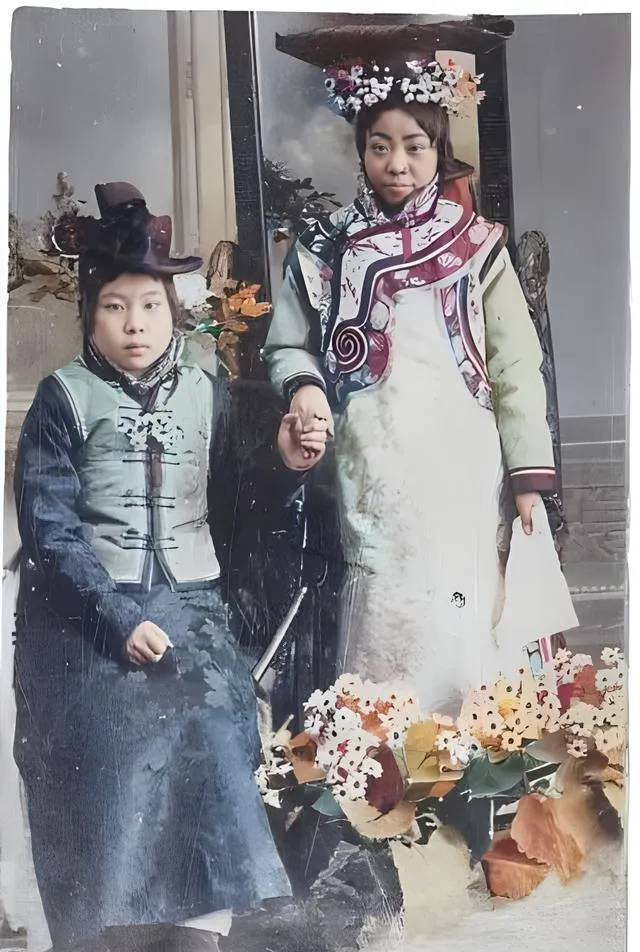 这对牵手的母女,衣色一深一浅,帽檐上堆花,像院里新开的菊,图中这类装束叫旗装,袖口肥,领子硬,站定了就像一根挺直的竹,女儿眼神发紧,手却攥得牢,像在学着做一个体面人,先学把手握稳。