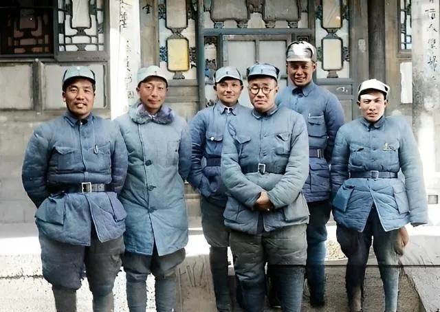 那时候拍这样的合影,多半是完成一次任务或者临出发留念,前排人攥着手套,背后门楣上的框匾像一双眼睛,黑白片上是沉稳的灰,给它上色后,布料的毛边和磨损都浮出来了,颜色不花,劲儿却更足了。