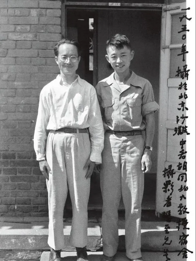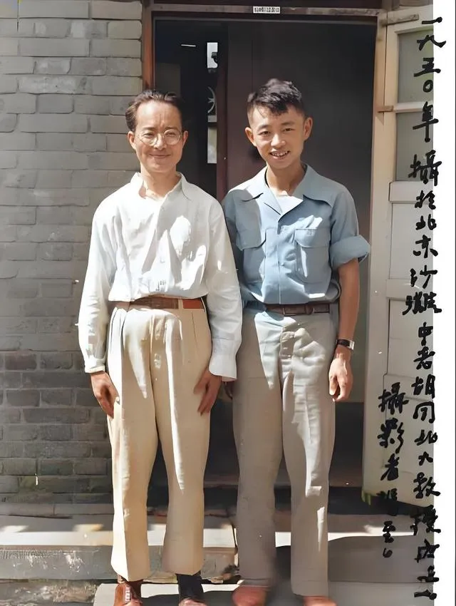 这个并排站在门槛上的身影叫旧式便服配工装裤,左边白衬衫雪亮,裤线熨得笔直,右边浅蓝上衣,口袋翻盖小而齐,袖口随手挽起,腰间皮带扣成一横,站姿都有点收着劲,砖墙的缝隙里卡着纸条,像当年的便条本,阳光从院子里斜斜打过来,眼镜片里闪着一点亮。