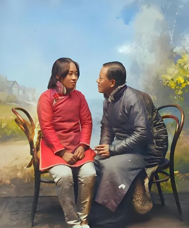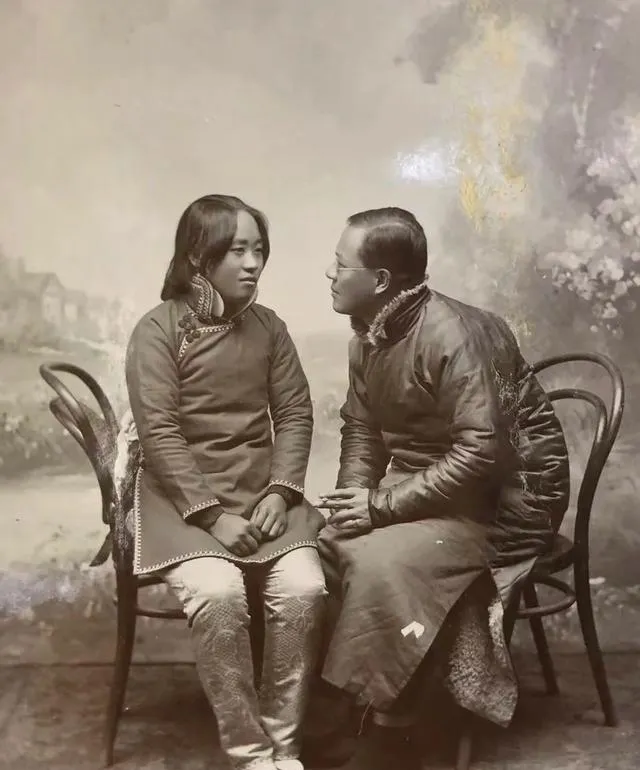 图中这对面坐的姿势叫文明照相的对坐,椅子是曲木靠背,男人的长袍马褂是深墨蓝,里衬羊羔边悄悄翻出来,女人穿的是石榴红对襟短褂,边上滚着白色牙线,袖口略宽,双手叠在膝上,眼睛往旁边轻轻瞥,男人身子向前,像是要把话压低了说,摄影棚的油画布景有树有屋,像梦做了一半。