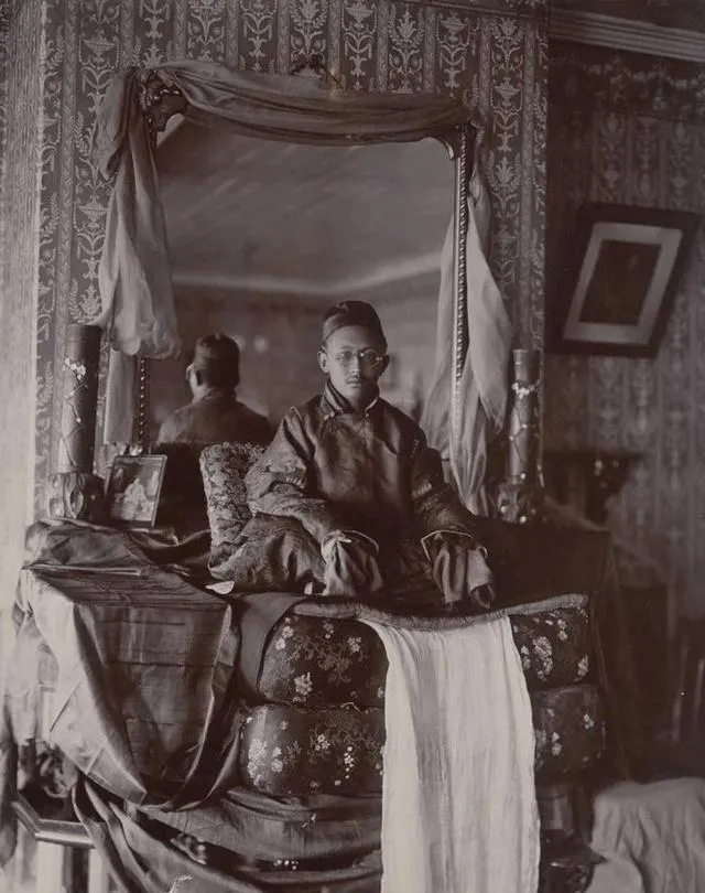 这个屋子里最醒目的东西叫西式梳妆镜和藏式坐垫叠榻,镜框雕着花,角上挂着绸带,床榻上层层叠叠的缎面靠垫,青蓝与暗红交错,前缘搭着一条洁白的哈达,班禅端坐其上,手袖宽大,指尖露出一点,帽子是丝质凉帽,帽檐圆而稳,镜子里背影一并被收下,像给自己做了个印章。