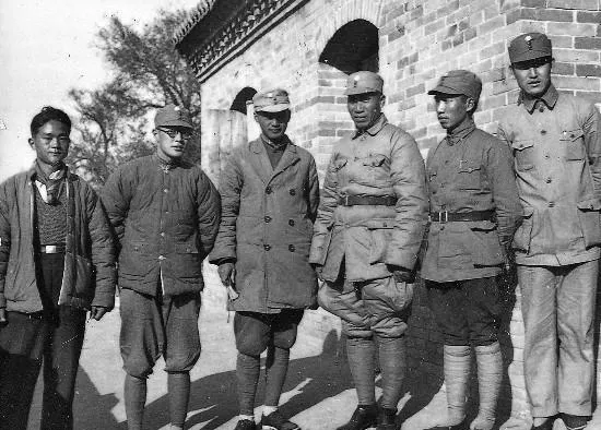 图中这排立在城砖下的人,穿的是棉大衣加短呢外套,颜色从军绿到土黄一溜排开,裤腿都是绑腿勒紧,手插在袖筒里挡风,头上的帽徽在光里一闪,背后城墙的马面露出一角,砖缝整齐,地上影子拉得很长,像把一天的路都量过一遍。