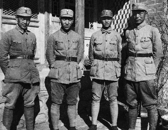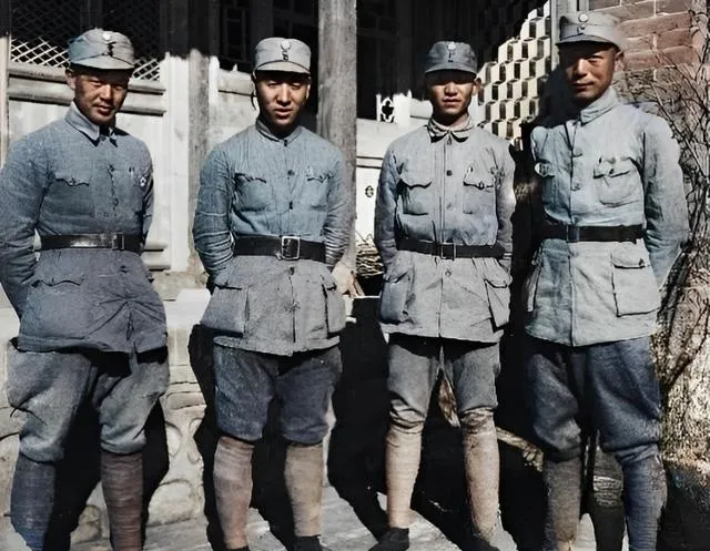 这个四人并列的阵仗叫作战前留影,胸前口袋双盖,笔袋卡在第二个扣子旁,腰带头朝左,帽徽压线正中,第二个人的表情有点倔,第三个微微眯眼,像是乡下冬天晒太阳时的神情,脚下的土路被踩得结实,门柱的木纹里有年轮,风从廊下穿过,衣角一齐往里收。
