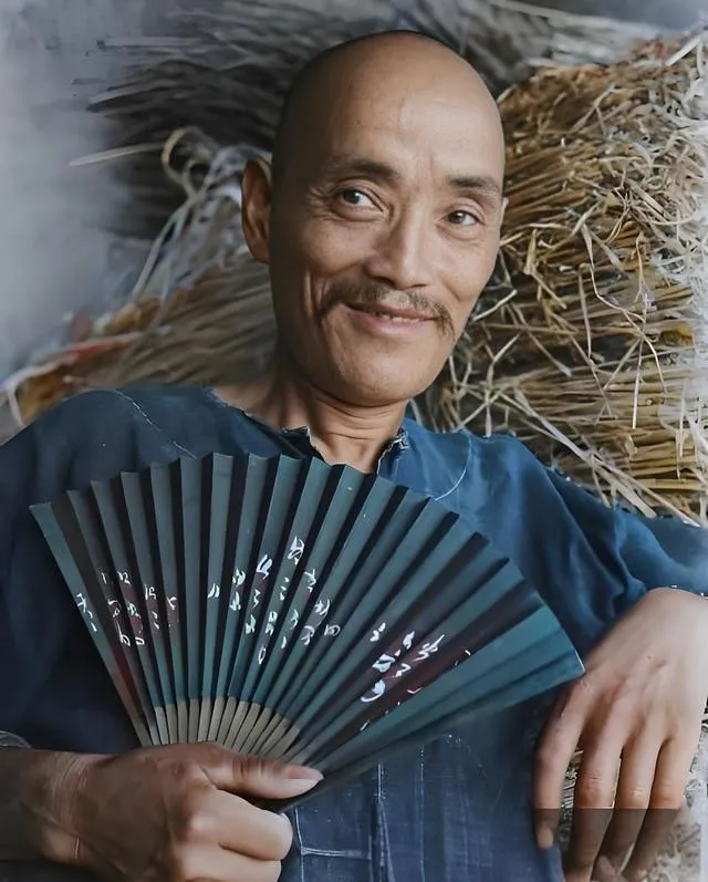 图中这位中年人最抢镜,光光的天庭一照太阳就见亮,手里那把宣纸面折扇,扇骨是浅色竹,扇面刷着墨青,几笔小楷在上头跳,扇子一开一合,有股子会聊天的劲儿,眼神里是掰开揉碎的机灵劲儿,像在跟镜头打趣呢,旁边一蓬稻草当靠背,软硬正好,坐姿一放松,这画面就有了烟火气。