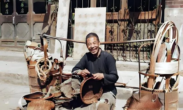 这个拿刀剖青篾的手艺人叫编竹匠,腿边一圈工具,刮刀亮,篾条湿,篮口细细收边,笑得见牙不见眼,手上没停过,竹子最怕干裂,他用湿布一裹,再顺着纹理压,比心还顺,奶奶说,过去买菜提篮就找这样的匠人做,分寸拿得稳,当年我也坐在一旁看,最爱看他把篾条压出“嗒”的一声,像给篮子按了一个扣子,现在超市一元一个塑料筐,轻是轻,就是没这个味儿。