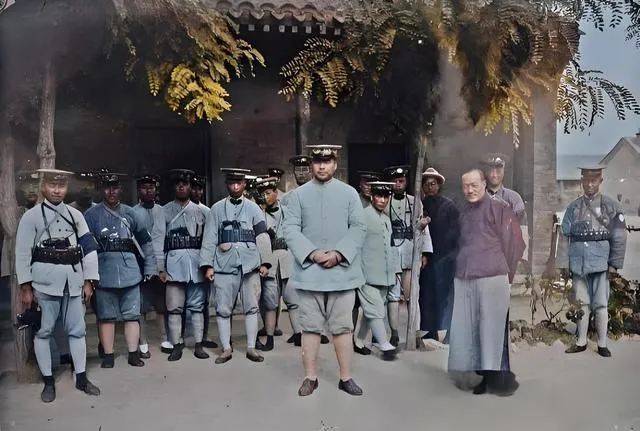 这组身着呢制服的卫队站成一排,腰间皮带结实,袖口起了褶,院子里树影碎,站在中间的那位挺着胸口,旁边老者衣襟宽大,风一吹摆两摆,镜头按下那一瞬,静得能听到脚后跟落地的轻响,这样的合影在旧影集中常见,家里长辈翻到类似的照片,总要指着说,这是谁谁谁,那时人少物少,拍一张就谨慎,现在出门随手一按,照片多得存不下,可越多越记不住脸。