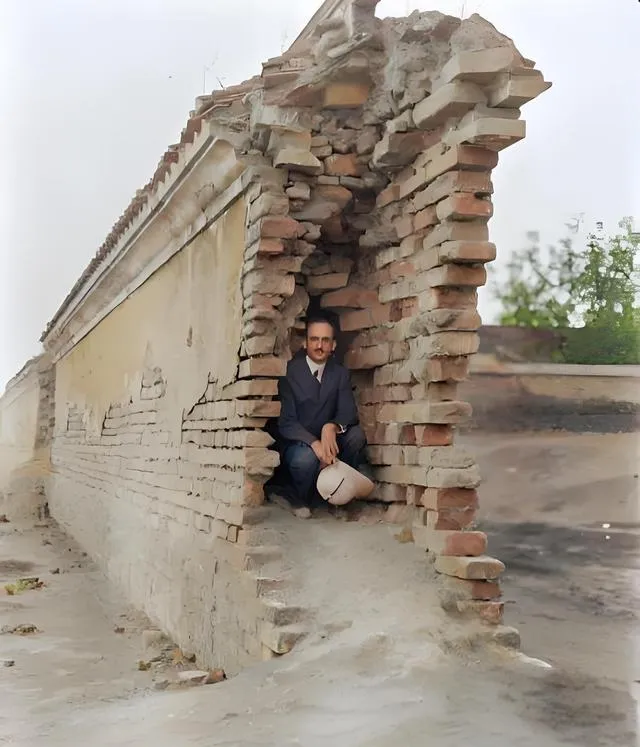 民国上色老照片:神似光头强的成都男子;美国人在城墙夹层中摆拍。