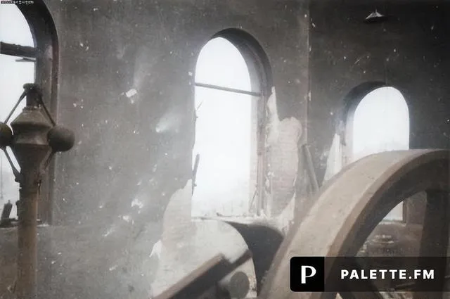 这张能看到半截墙面和高烟囱,砖眼里冒着白气,炉台像被掀开了盖,一块一块乱放着,老工友说以前这地方热得跟火炕一样,现在凉了,敌人的腰眼就凉了。