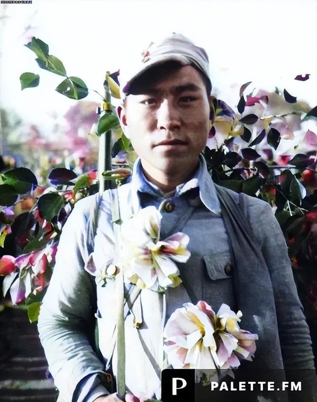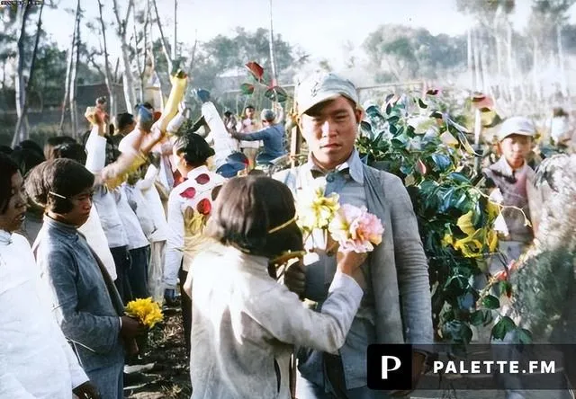 这位胸前戴着花环的战士,眉眼沉着,肩上的背带被衬得更直,名字不提,英雄不靠标签,只看他那身打扮和站姿,就知道是打硬仗回来的,乡亲们把最艳的纸花往他身上别,鲜亮得扎眼。