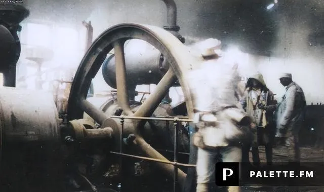 图中这台大轮子是飞轮,带着皮带跑,一圈圈叠着力,战士们穿着灰蓝色棉布衣服在旁边检查,谁拿着小本记数字,谁扶着管道听声音,分工清清楚楚,像在修自家屋顶。