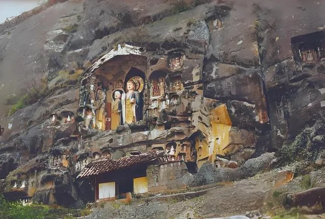 图中这片凿开的岩肚子叫摩崖大龛,三尊主像立在半腰,衣纹被颜料一抹,金黄里透着温,龛檐像个石雨棚把风雨挡着,凑近能看到指尖圆润,耳垂厚实,石缝里长出点野草,绿得俏皮,小时候我第一次见到这种石佛,脑子里就记住了一个事,石头也能被人刻得有表情,安安静静看你一眼,就不想走了。