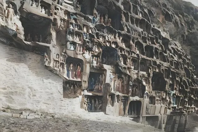 再贴一处洞龛延展,从下到上全是洞,像蜂巢,细看能见到某个小菩萨眉眼还留着赭红,石面被水线抽出一道一道,像岁月在打刻度,朋友问这些是谁雕的,我说哪是哪朝的匠人手上功,一锤一凿,背后是看不见的寂寞工夫,以前做事慢,现在做事快,各有各的好吧。
