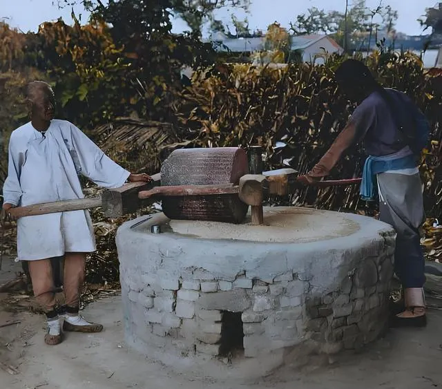 这个粗红石头砣叫碾磨,木把子横伸出来,两个人一前一后推,磨眼里喂的是小米,转一圈,细面就从边上泛起来,母亲脚下踩得稳,布袜子露着一截脚踝,儿子把腰一弓,咯吱一声力道上了,妈妈看了笑,说那会儿晚饭前她也推过,赶紧磨够明早蒸窝头,锅台边一有热气,一家人就不闹腾了。