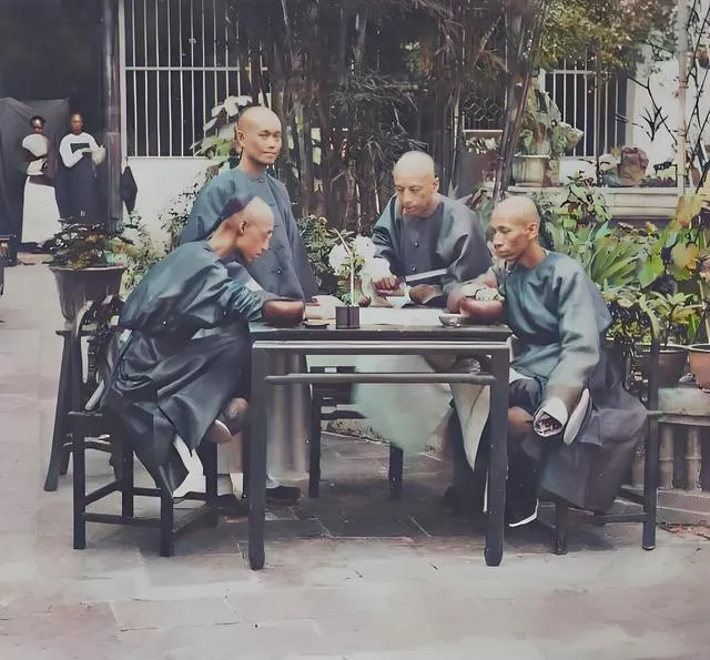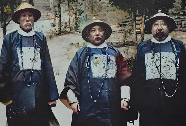 这个穿着补服的装束叫朝服,胸口一块方补绣了飞禽走兽,说明品级不一样,圆帽檐压得低,串珠绕颈一圈,走起路来叮咚轻响,有朋友问谁是谁,我也不敢认,名字不重要,重要的是那股子官样气,站姿一摆,肩背像有把尺,以前照片难得,站定了才按快门,现在随手一拍,倒也不再端着了。