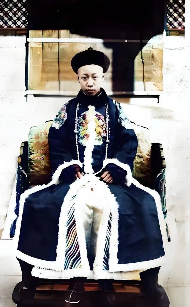 这一身绒边大袍是冬制礼服,领口袖口滚白,正中一抹彩绣特别抢眼,坐在圈椅上,脚不点地,眼神却老成,像是被告诫过“坐稳了别动”,我看着只想起一句话,衣服是暖的,椅子是硬的,日子不一定轻松,那时候讲究出身和规矩,现在多讲选择,换谁都得学会自己做主。