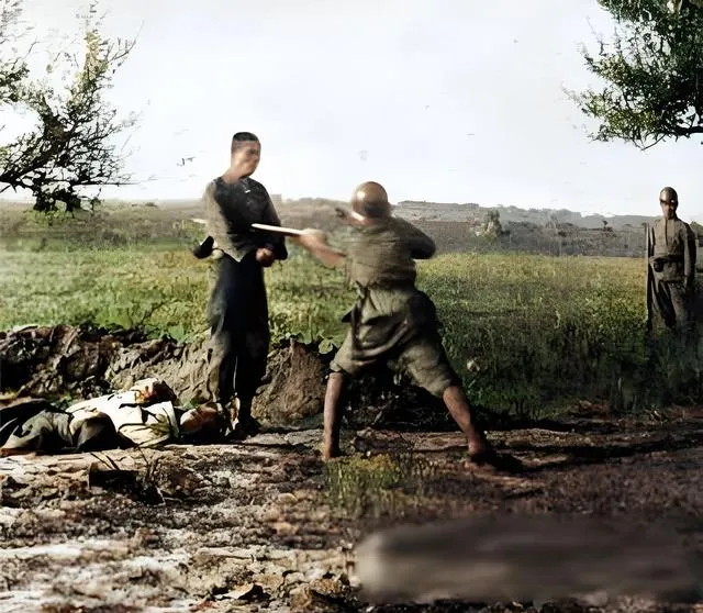 画面里的两个身影,一个端着长枪,一个挥着木棒,旁边还有倒地的身躯,这个场景叫把百姓拉到郊外练刺刀,地边长着些荒草,树影斑驳,阳光正明亮,他们却拿活人取乐,爷爷说那阵子村里男人都不敢单出门,听见远处军号就往地道里钻,躲迟了,命就交代了。