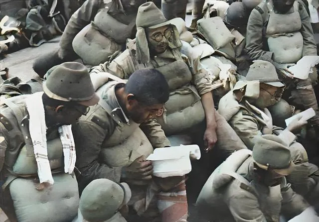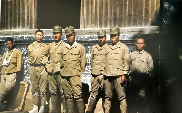屋檐是木板搭的,窗洞黑着,几个人大小不一站成一排,袖口磨得起毛,衣领油光,左头一个胳膊还缠着绷带,看样子刚从前线退下来,他们靠在墙上眯着眼,太阳晒得人犯困,背后却是一地狼藉,这种疲惫不是干正事累的,是作孽后的倦。