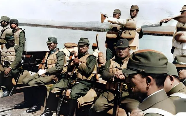 这两张是在河上,坐着木船,身上绑满救生垫,腰间别着枪,前排有人把枪抱在胸前,后排站着的在指手画脚,像给谁上课似的,旁白里写着视察、渡河、推进,听着都体面,可换个角度看,黄河是我们的母亲河,他们却把它当战场的走廊,浪头拍在船舷上,像在拍他们的脸。