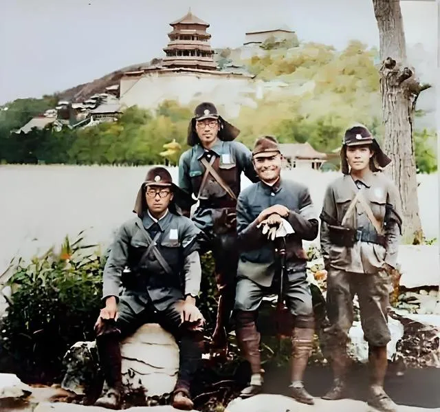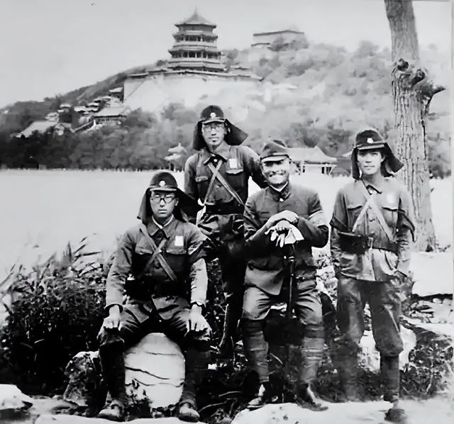 这四个军服兵戴着带帘的帽子,帽檐后垂一块布,号称能挡风防晒,实则成了侵略的记号,背后是万寿山的轮廓和湖光,玉石台阶、假山草木都在,他们却叉腰咧嘴拍照留念,像进谁家后花园摆造型,那时北平刚陷落,城里还冒着灰,他们却在皇家园林里逛荡,这一笑,笑在我们心头发疼。