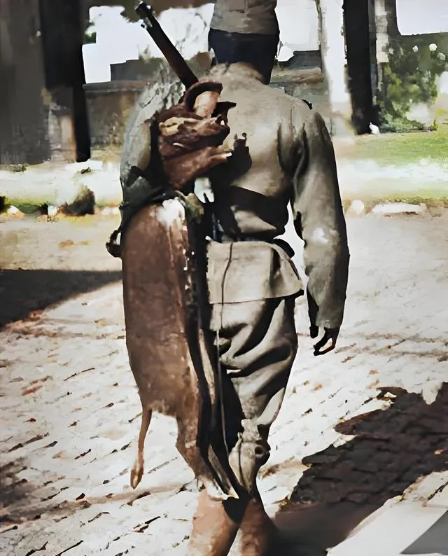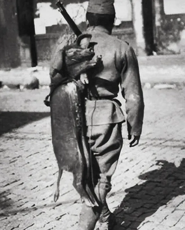 这张背影照叫行军路上的劫物,一个人步子迈得不快不慢,枪在背上横着,肩头压着一整只猪,四蹄垂着,肚皮朝外,像刚从谁家的圈里拽出来,村里人见着这种阵仗只敢把门带上,妈那会儿叹了一句,抢去给他们改善伙食了,地里忙活一季,点灯熬油攒的牲口,就这么被他们拖走了。