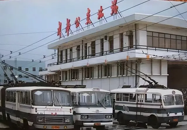 图中三辆带翘嘴受电杆的家伙叫无轨电车,白灰两色车身,腰线一圈压得很稳,车顶两根长长的集电杆抬着头去找电网,站台楼上红字牌子亮得很,八十年代的成都就是这股子精神头,妈妈说那会儿早高峰挤车得靠经验,前门上后门下,司机一脚油一脚电,过弯要是脱了杆,售票员咔哒一下就把杆儿拎回线里,动作干脆利落。