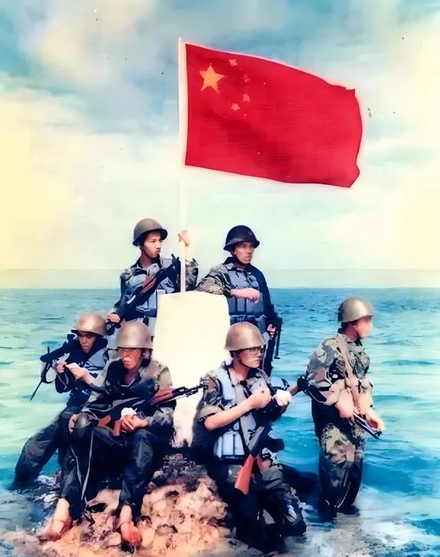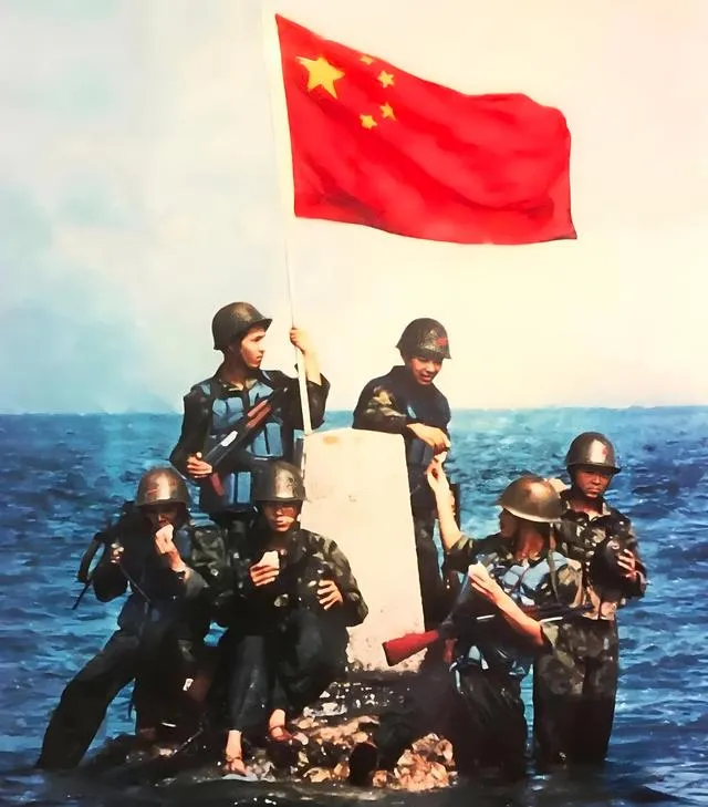这个高举红旗的画面叫“华阳六虎登礁”,钢盔、救生衣、海水到小腿,礁头上立着界碑,旗杆笔直,风把五星红旗拉满,兄弟几个各自端着枪守着四角,像钉子钉在浪花里,爷爷看这张时就一句话,海是会变脸的,可旗不能倒,以前我们在地图上看南海像一片蓝,现在看见的是人站在海上,心里就不虚了。