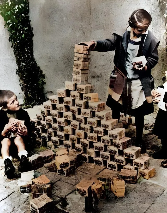 图里这堆小砖块其实是成捆的马克纸币,孩子们把钱当积木玩,不是淘气,是因为钱不值钱了,通货像疯了一样涨,手里攥着厚坨坨纸也买不到面包,外婆感叹说,钱要是失了信,手再快也抓不住生活,以前我们觉得“票子票子”是本事,现在知道稳定才是命根子。