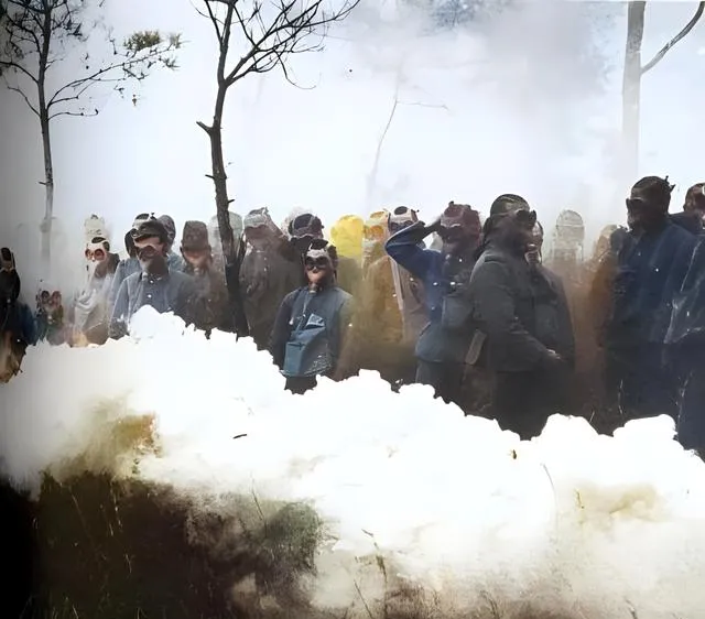 这团白雾不是雾,这叫化学毒剂的试验照片,面罩、披风、紧贴的姿势都在说一件事,躲,能躲一点是一点,日军在华中的毒气、细菌,留下的不是战场上的伤口,而是村子里长年不散的病,爸爸说起这个就沉默,没什么大道理,只有一句,记住了,别让历史再来一遍。