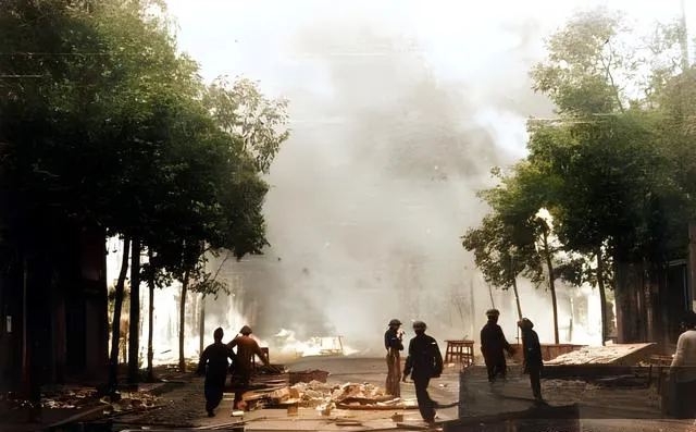 这张火场照片叫南昌被轰炸后的街口,屋脊没了,梁架露着骨头,黑烟压下来,路边站着的人像被烟给钉住了,消防的人提着水带跑,跑起来鞋底打滑的声音我仿佛都能听见,以前我们盼的是天晴晒谷,现在的人遇到火情会掏手机拍,可那时谁还有工夫拍,能活着把火压住就是本事。