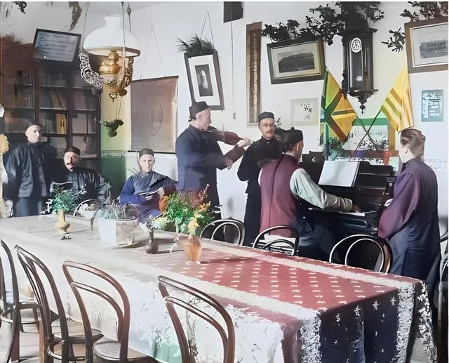 这张里头有人说话,有人拉弦,有人按琴键,这个组合就叫中西合奏,长衫与西装挤在同一张桌边,墙上挂钟哒哒响,桌布是大块的红白格,角落摆着盆栽,钢琴边那位手腕一沉,黑白键像下了小雨,传教士凑了过去点头示意,老师在旁敲着节拍,像在提醒,别怕错,错也是音色的一种,现在的小朋友上琴行,排队三小时,过去的人凑在客厅里,几把椅子就成了舞台。
