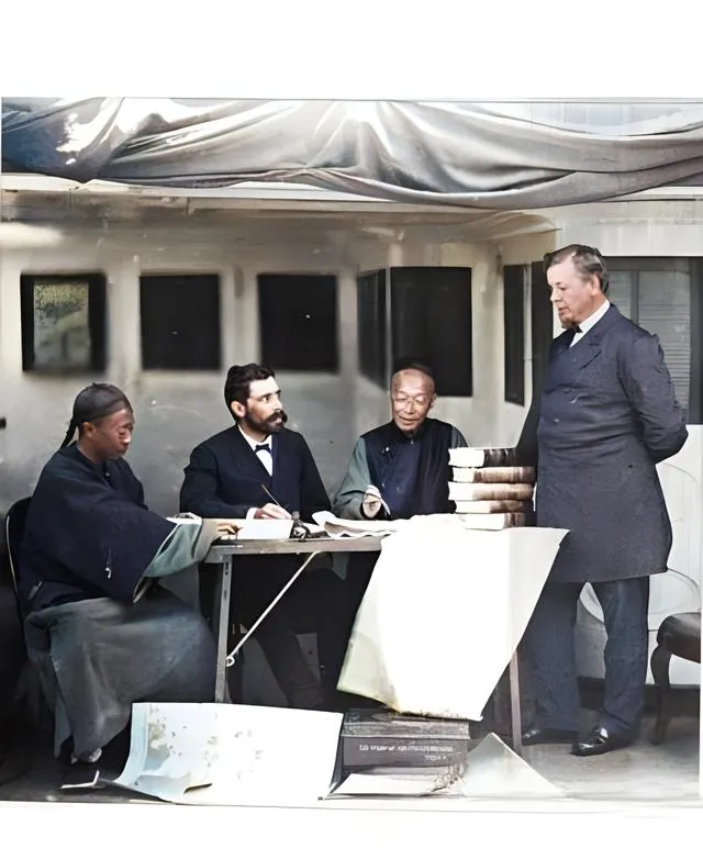 这个场面里两位穿长衣的叫通事,也就是翻译,桌上摞着厚书,纸边卷起毛刺,油灯罩下去,把每个人的侧脸推了出来,西装的先生抬着下巴,像在问句逗号到底放哪儿,年长的通事笑了一下,笔尖一顿,把词换了个顺序,妈妈说,做翻译最难是心不站队,夹在两种语里走钢丝,走稳了才有人信你,现在咱开手机翻译一扫就过,以前靠的是一张嘴一支笔。