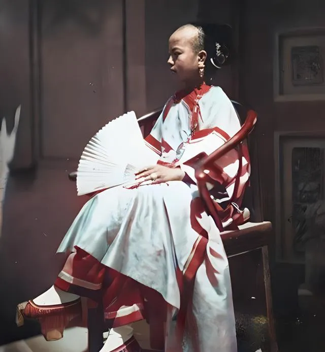 这个打扮精致的女子叫清倌人,脚上穿高底的三寸鞋,椅子是红木圈椅,扶手有道温润的弧,手里把一把折扇捏得紧紧的,她等的人叫龟奴,肩扛人行走的活计可不轻,奶奶说,倌人上门去唱,局票一递,规矩可多,连扇子合拢的声音都有讲究,以前女人走路被鞋子绑着,现在跑步鞋一穿就飞,时代换了,脚下才真的放开了。