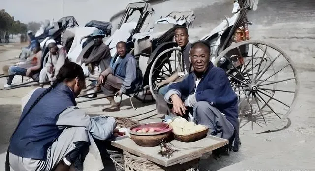 这个摊子就叫杂货摊,竹匾里装着鸡蛋和切开的红果,路边一排黄包车靠着,车把像一串曲折的黑线,车夫围着聊家常,笑纹挤在眼角,摊主盯着镜头有点愣,说白了是把好奇放桌面上了,外公买过车夫的茶水票,几分钱一个大搪瓷缸,现在打车掏手机点两下,那时叫一声师傅,人就跟着跑了。