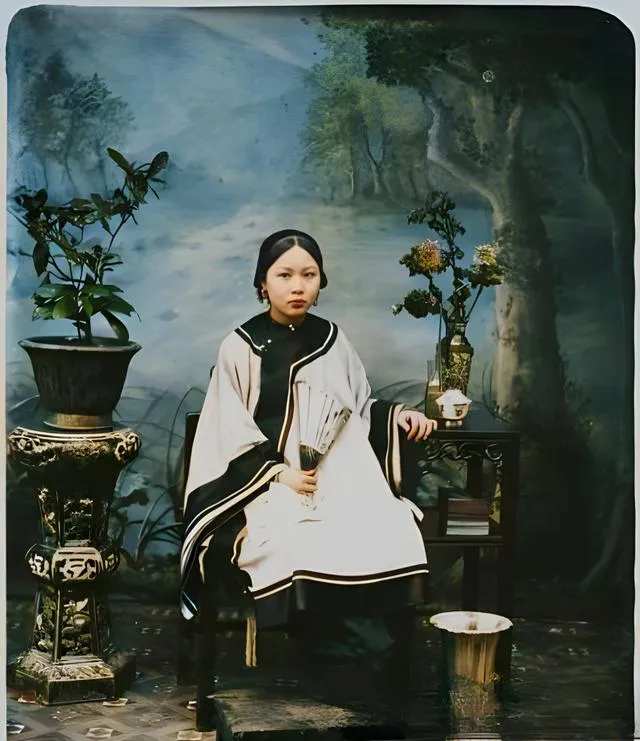 这个端坐的叫仕女坐像,黑白滚边的披肩压得人更瘦,手里是一把小扇,桌上摆铜花器和一盏茶,地面瓷砖有冷光,摄影师显然爱她的侧脸,给她留了半个空,像是让话慢点出来,爷爷看了直说,这眼神像是打量未来的价码,现在女孩子拍照会加滤镜,以前靠的是灯位和耐心。