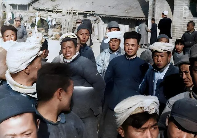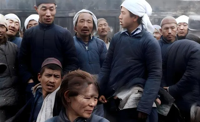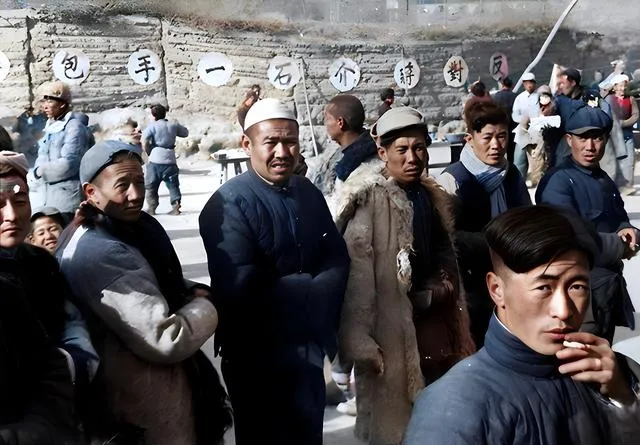 这个灰墙前的聚拢叫合影前的等候,蓝灰棉袄一色,头上包着白巾,脸被冷风吹得通红,眼神亮亮的,像刚从地里回来,衣襟上还沾着一点土。有人咧嘴笑,有人抬下巴说话,照片上的热闹不靠滤镜,全凭真实。