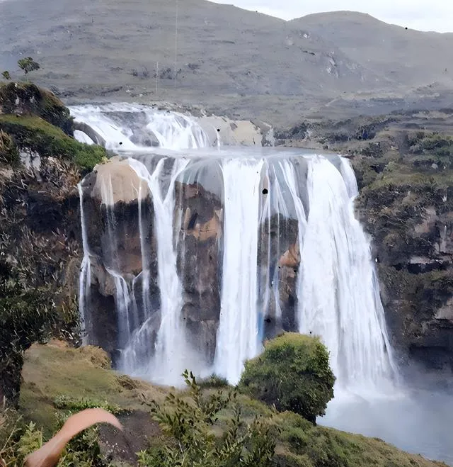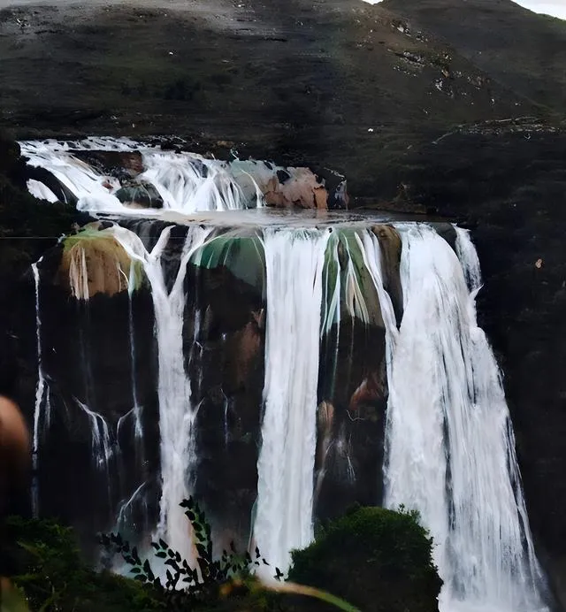 这个角度贴近悬崖,主瀑落差大,腰线像被风拽住的白绸,下面水潭发青,边缘打出一圈白沫,站在边上,裤脚总会被雾气打湿。我爸说,夏天去看最过瘾,站五分钟,满身都是雨点。