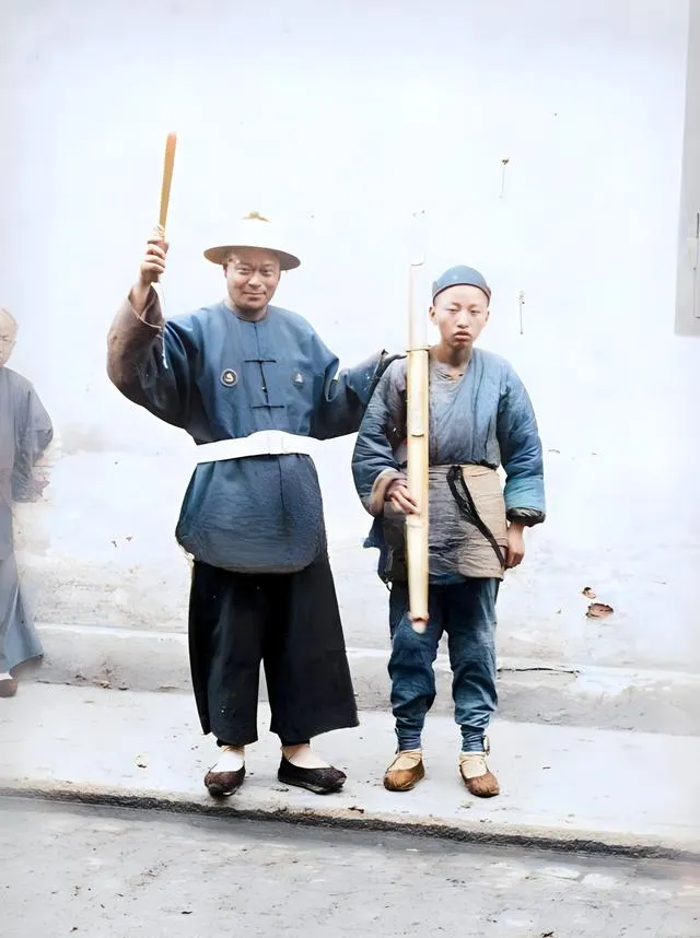 这两样拿在手里的,一个是木杖一个是长尺样的告示杆,腰间扎白带,鞋底厚,站姿挺,像是门口负责维持秩序的人。我猜他们嗓门得不小,一句话能把院子压住。