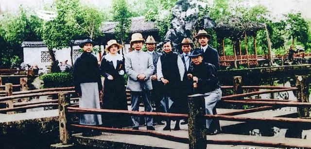 图中这处园子在杭州西湖边,木栏交错的小桥上,几位先生太太一身呢料长外衣配软呢帽,衣角压得平平整整,领口别着小胸针,手杖轻点桥面,笑意都收着不撒漫,站在中间的这位神情沉着,像把所有烦心事都往帽檐下一压,不让人看出来,朋友作陪,江南的风吹在袖口上,照片里却藏着一个时代的低谷与蓄力。