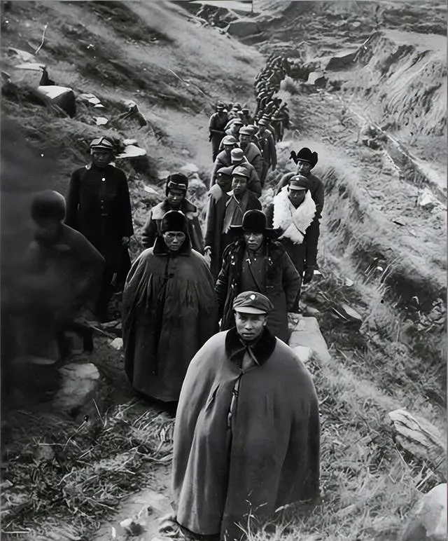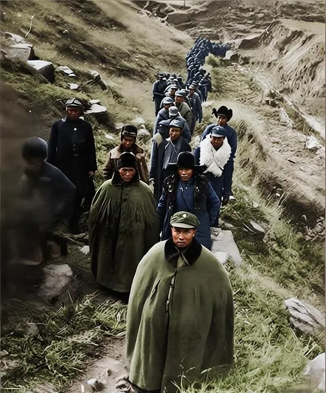 这个行军队列叫出川川军,前头披着厚披风的军长走得稳稳当当,毛呢披风垂到膝盖,扣子只系上最上面一枚,里头的棉袄露出一小截领根,后头战士们一字排开,帽檐压得低,脚下碎石嘎嘣作响,山风往披风底下灌,领边全是起毛的旧呢料,妈妈看见这张图说,咯,你看他们穿得不齐整,却一眼就能看出队伍的劲儿是往前的。