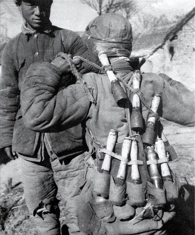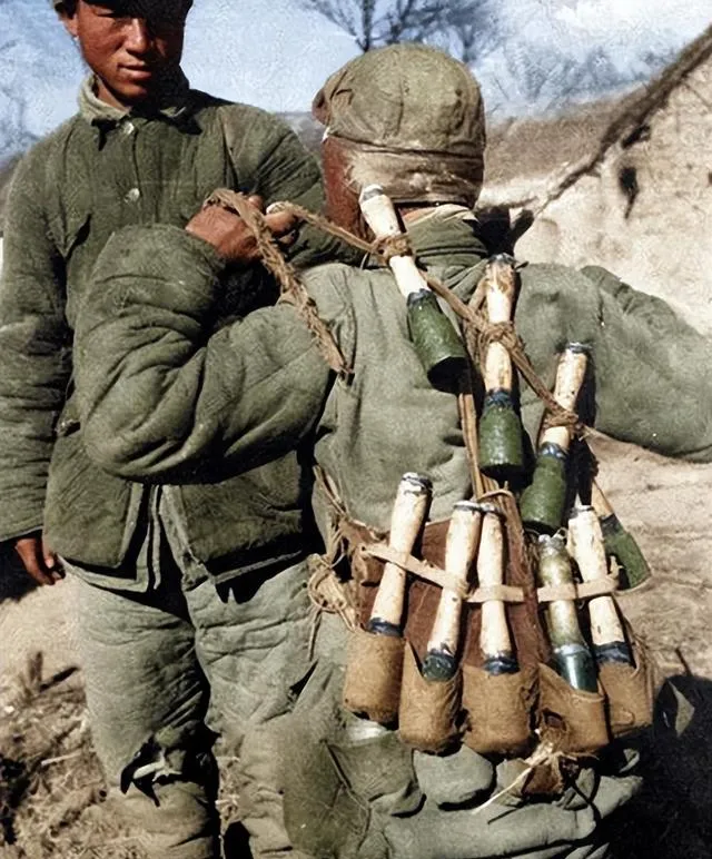 图中背上的一串串木柄,是把手榴弹扎成的串子,粗麻绳在棉袄上勒出几道槽,棉线头蹭得毛毛糙糙,木柄被掌心磨得发亮,像擦了油,战友站在一旁没说话,眼神落在那坨重量上,风从梁场吹过,绳结小幅度抖动,谁都知道这是一趟硬仗,回头就难了。