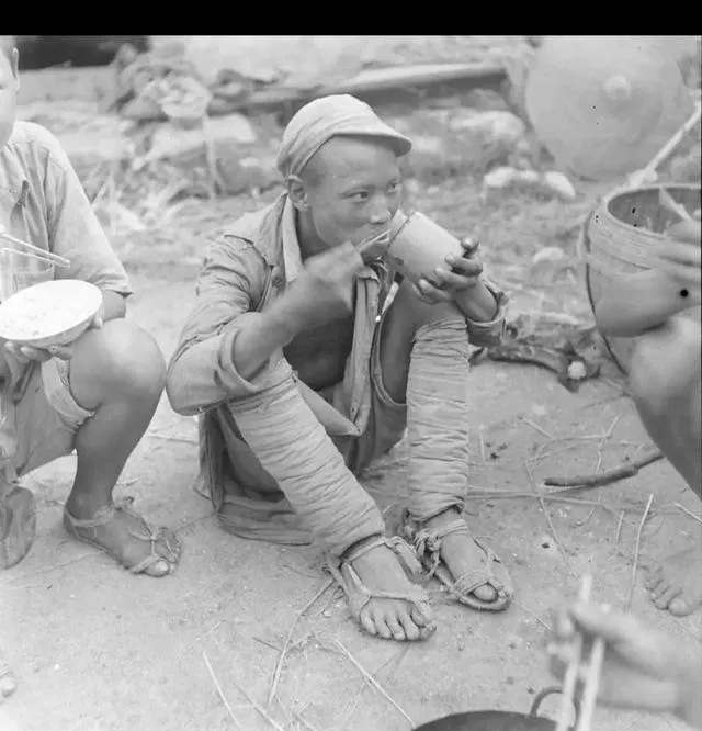 这个坐在地上扒饭的孩子,是穿草鞋的少年兵,袖口松得能塞一只拳头,脚上绑腿缠得紧紧的,草鞋鼻儿顶在脚背上,露出两个脚趾头,手里捧着粗瓷杯咕噜咕噜灌汤,旁边同伴端着破口碗,草屑落一地,像刚从阵地上撤下来,赶着填肚子,奶奶看见照片念叨了一句,孩子还小呢,拿筷子都没拿稳。